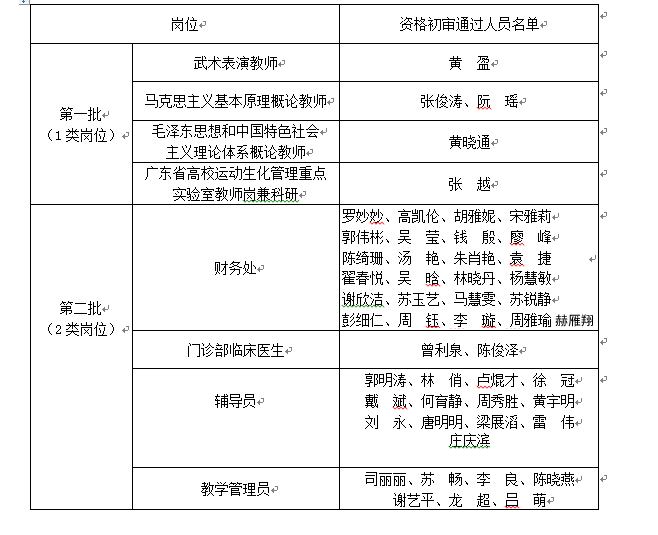 为了有序地做好本次招聘工作,把招聘分两批进行。第一批(1类岗位):武术表演教师、马克思主义基本原理概论教师、毛泽东思想和中国特色社会主义理论体系概论教师、广东省高校运动生化管理重点实验室教师岗兼科研共4个岗位;第二批(2类岗位):财务处、门诊部临床医生、辅导员、教学管理员共4个岗位。